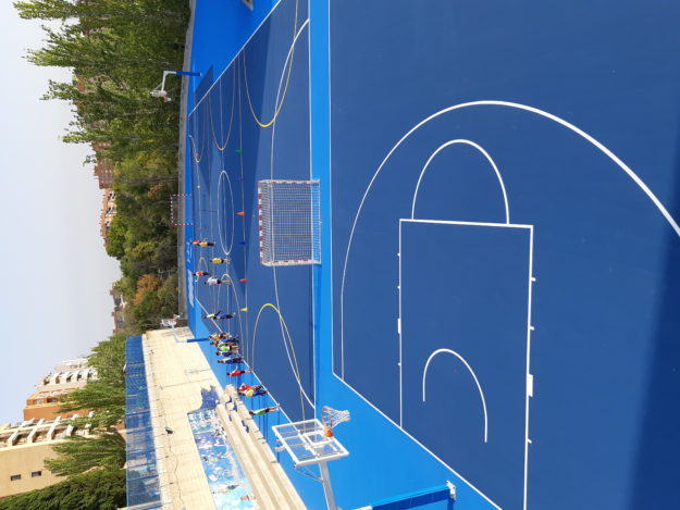 Cliente: Sagrado Corazón (Alfonso XIII). Agosto 2019. Tipo: Pavimento de PVC. Actuación: Repavimentación con PVC Estamina de doble capa de uso y marcajes deportivos, restructuración y mantenimiento canastas motorizadas.