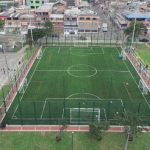 Actuación: Construcción de la cancha sintética de Fútbol 8 con suministro e instalación de grama de 60mm FIFA Quality, Adaptación de cerramiento contra impacto, demarcaciones para 3 canchas y equipamiento deportivo.