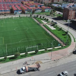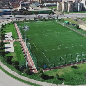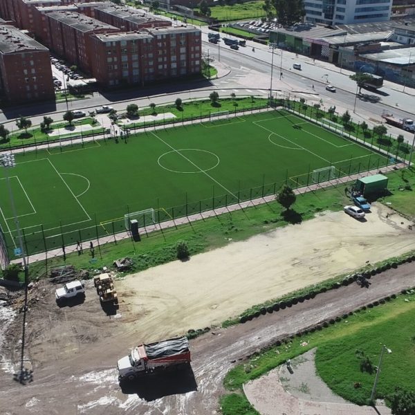 Cliente: IDRD Tipo: Cancha de Fútbol. Actuación: Construcción de cancha de futbol en césped sintético con equipamiento y cerramiento contra impactó.
