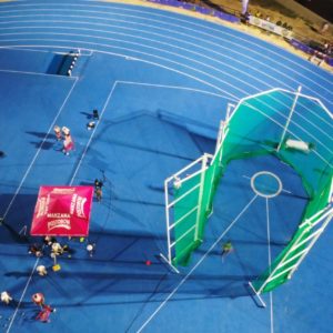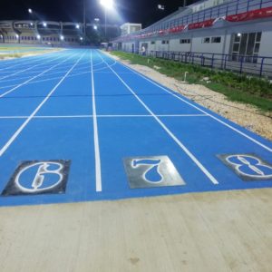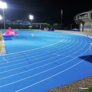 Actuaciones: Instalación de pavimento BSS1000 100% poliuretano Insitu para pista de atletismo homologada por la IAAF para clase 2, con equipamiento deportivo y pista de calentamiento en el mismo material.