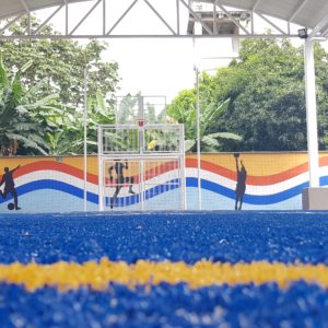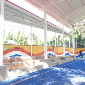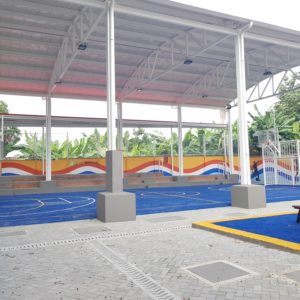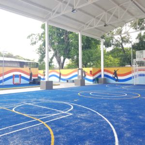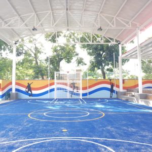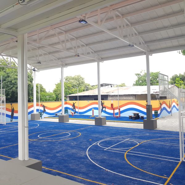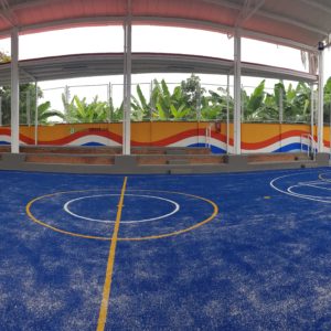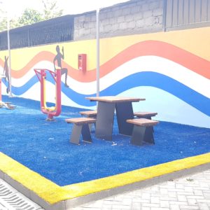 Works Carried out: Maintenance to the game area to the sportive center, supply and installation of synthetic blue grass with demarcation, sportive equipment and urban furniture, adaptation of the metallic cover and implantation of illumination with rehabilitation of the perimeter area.
