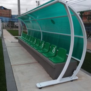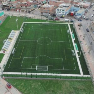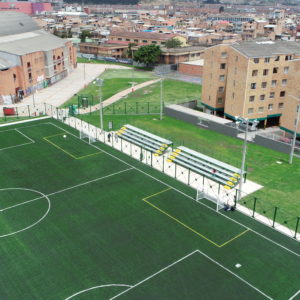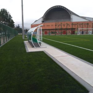 Works Carried out: Construction and adaptation of the synthetic grass field at Leon XIII Sport center – Soacha, Cundinamarca. Supply and installation of FIFA Quality 60mm Powerblade synthetic grass of EDEL GRASS, FIFA Certify plus synthetic grass for running track, this sport center has soccer equipment, counter impact enclosure, and stands for players.